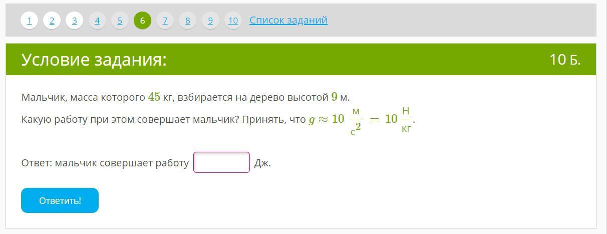 3)A=F*S=mgh=45*10*9=4050 Дж.
