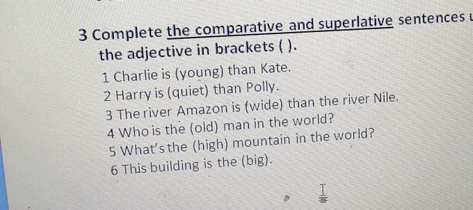 3 Complete the comparative and superlative sentences using the adjective in brackets (). 1 Charlie is (young) than Kate. 2 Harry is (quiet) than Polly. 3 The river Amazon is (wide) than the river Nile. 4 Who is the (old) man in the world? 5 What\'s the (high) mountain in the world? 6 This building is the (big).