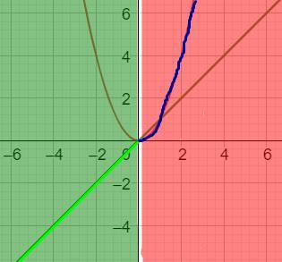Аналогично, y=x^2. Это парабола, кстати. Существуют теперь только те точки графика, у которых x > 0 (заметь, точка, у которой x=0, не существует при таком неравенстве). Красным я показал область, в которой находятся те самые точки. Остальные точки графика умирают мгновенной смертью. Синим я показал сами точки, которые остались в живых.