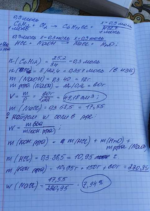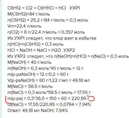 Газ, выделившийся при взаимодействии циклогексана массой 25,2 г. с хлором объемом 8 л.(н.у.), растворили в 150 мл воды. Какой объем 20%-ного раствора гидроксида натрия (плотность 1,22 г/мл) надо добавить к полученному раствору для его полной нейтрализации? Чему равна массовая доля соли в полученном растворе?