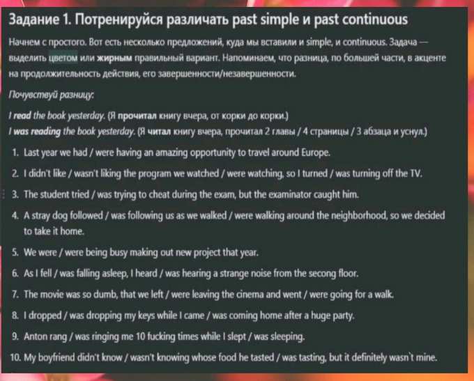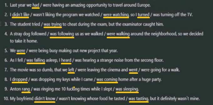 1. we had 2. didn't like, were watching, turned off 3. was trying. 4. was following were walking. 5. were busy. 6. was falling , i heard. 7. we left, went 8. i dropped , was coming. 9. rang i was sleeping 10. didn't know, he was tasting