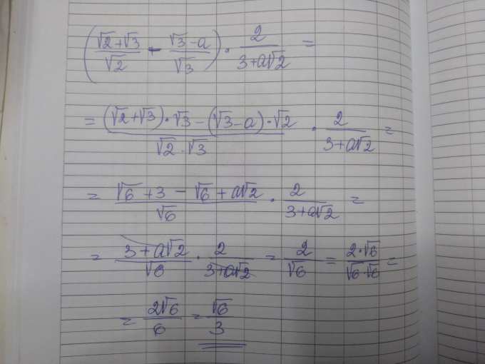 2 способ. Если внимательно посмотреть на дроби в первой скобке, то можно заметить, что после деления на корни там =(|/3 / |/2+а/ |/3)=(3+а|/2)/ |/6. И далее умножаем на вторую дробь.
